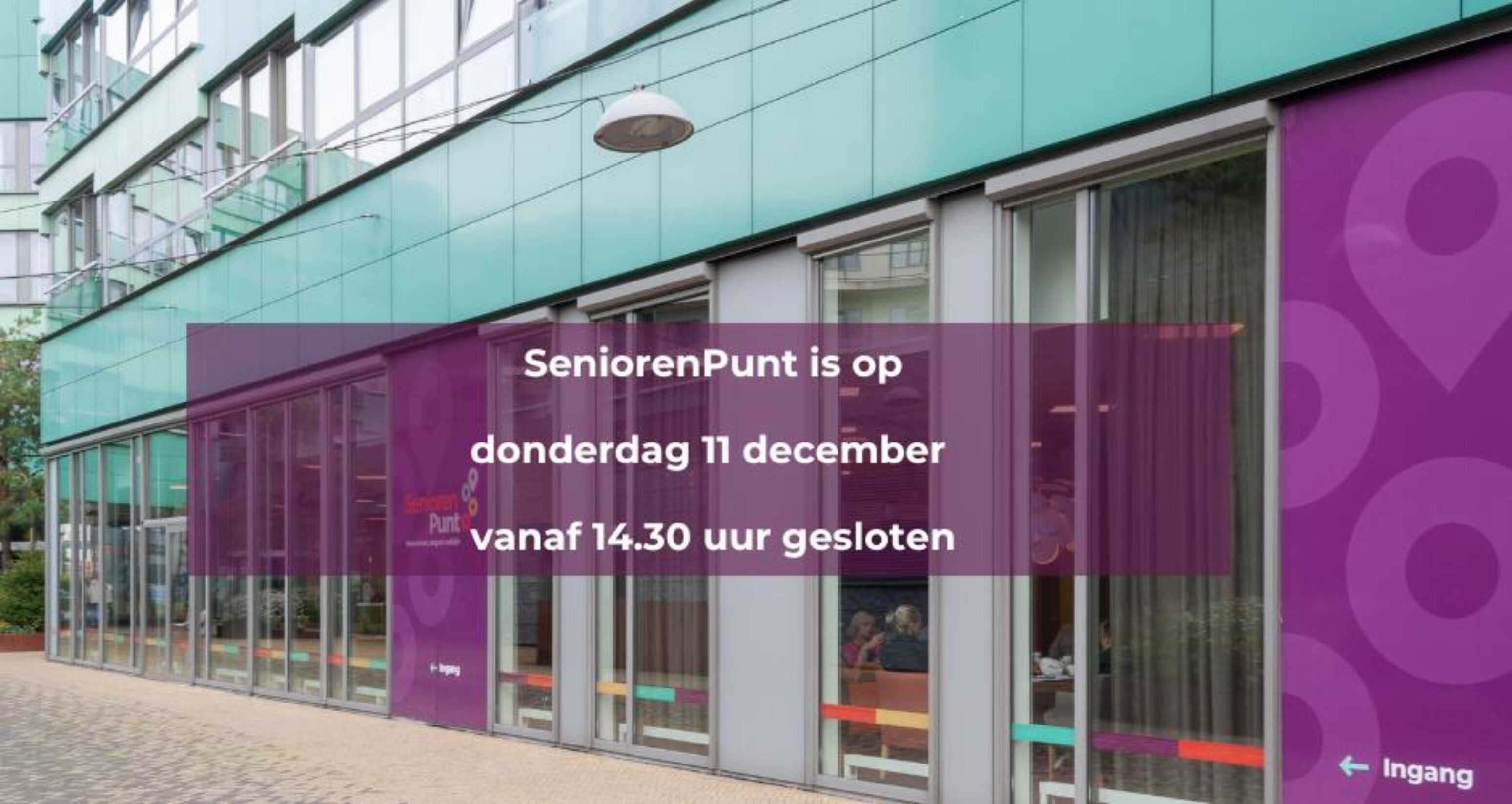 SeniorenPunt is op donderdag 11 december vanaf 14.30 uur gesloten. We hebben dan onze kerstpersoneelsbijeenkomst. Vrijdag vanaf 9.00 uur staan we weer voor u klaar.